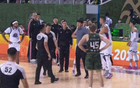 面对当值裁判的这个吹罚,山东队主教练邱彪十分不满意,于是就上前找裁判进行理论,然而,不理论还好,一理论邱彪更加生气,只见邱彪脱下自己的西装,愤怒地将自己的西装重重的砸在地上,同时,就冲到场上,要和裁判进行理论,还似乎要打裁判一样……看到这样的情况,山西队有两名球员,也是快速过来拉住了邱彪,没有让他继续扩大冲突……